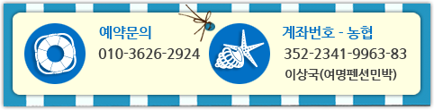입금계좌 : 농협 352-2341-9963-83 이상국(여명펜션민박) 우리은행 137-202076-02-102 이상국